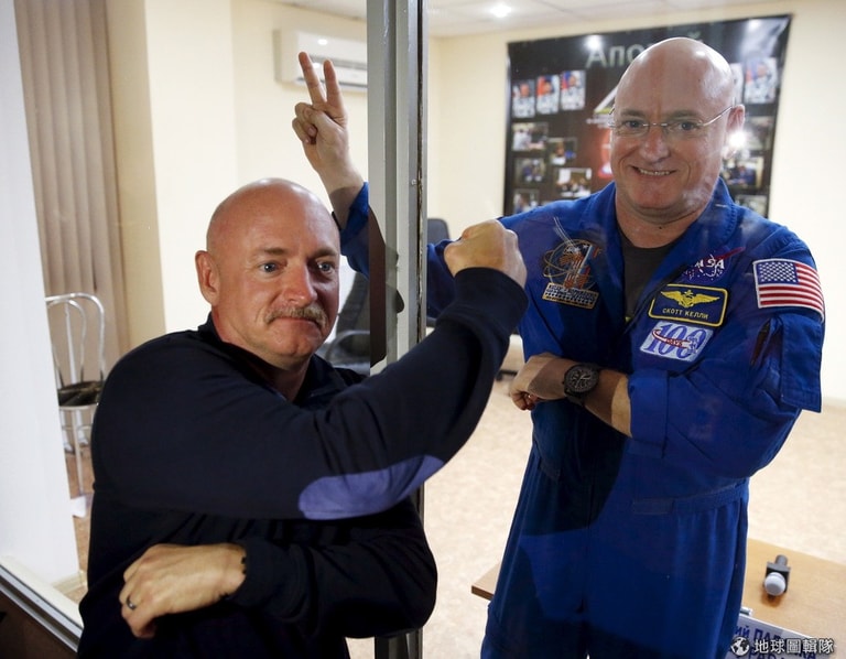 照片中右邊的是太空人凱利,左邊是他的雙胞胎兄弟馬克,馬克雖然已經退休還是參加了這次的研究。