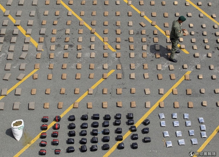 緝毒警察把一包包搜索而來的大麻平鋪在地上,他們在卡利市破獲運毒集團,總共查緝出 4.1噸的大麻。
