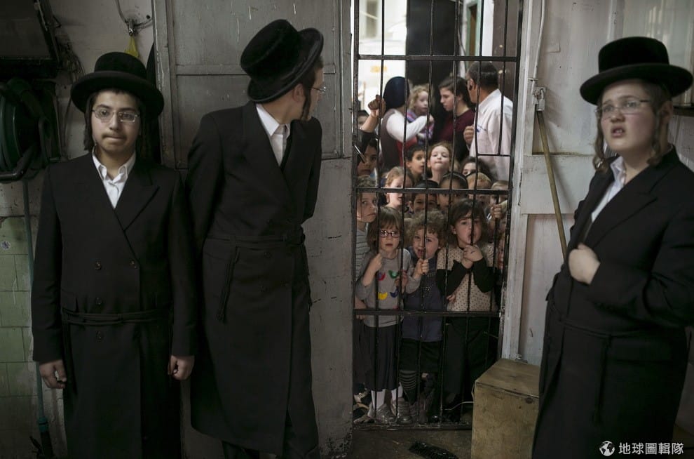 一群小學生從欄杆外看著極端正統派猶太人準備過逾越節的「無酵餅」(matza)。「無酵餅」(Matza),是一種完全無發酵、僅用麵粉和水做成的麵餅,早年猶太人祖先為了逃離埃及暴政,連麵餅發酵的時間都沒有,只得倉皇逃家,後人要紀念先人的苦難,每到逾越節就會吃這種無酵餅。另外,無酵餅扁平不膨脹的外觀,也提醒他們不能「驕傲」,要保持謙遜的態度。
