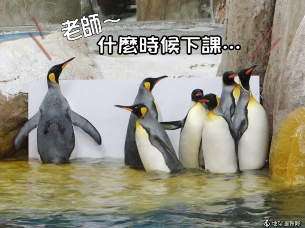 合作夥伴游泳課時間一到,遊客們可以看見企鵝們排隊準備進泳池,但越接近水邊,隊伍就自動分成兩列,願意游泳的企鵝噗通就跳下水,不喜歡游泳的企鵝卻立刻想調頭往回走,甚至用腳抵住,將整個身體重心往後倒,怎麼都不願意下水。