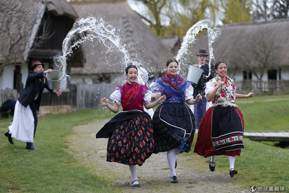 兩名男子朝三位穿著傳統服飾的匈牙利女子潑水,以慶祝復活節的到來,女子隨後得回贈復活節彩蛋給男子。這種慶祝方式在當地由來已久,最早可追溯至西元 200年。據說,最初不是潑水,而是直接把女子拉到河邊或水池把她們泡進水中,除了慶祝復活節外,也歡慶生機蓬勃的春天。