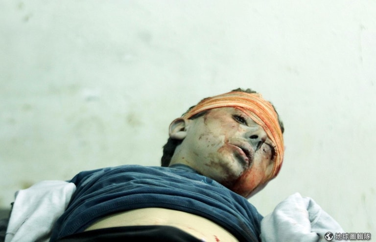 小男孩居住的大馬士革市區再度受到政府空軍襲擊,逃避不及的他在混亂中受傷。