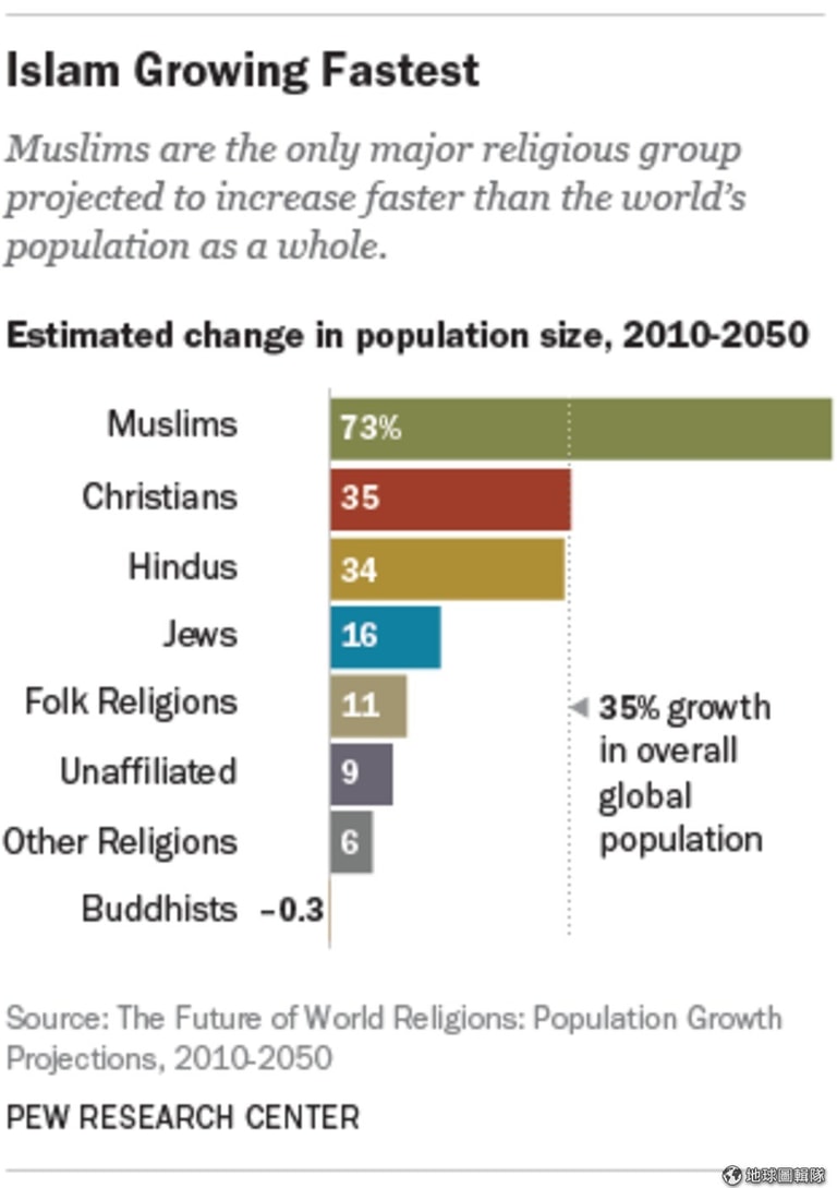 主要影響因子,來自各信仰人口的生育力,這份報告中就提到,信仰人口是否正處於具有生殖力的年齡階段會影響該信仰人口的增長,例如穆斯林在所有信仰人口中,擁有最高的生育率,平均每一位穆斯林女性會生下 3.1名子女,這遠高於全球平均的 2.1名,佛教徒的生育率則是每位女性 1.6名子女。