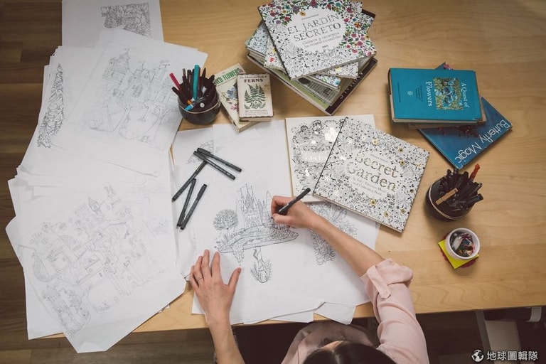 「我有童書仲介,我告訴他們我想要為大人出著色本,那時大人的著色本還不流行。我先畫了第一個故事,然後他們說:『我們來做吧!』我當時只是很簡單地想,像我這樣的人應該會喜歡著色本。我的目的只是出版一本我自己也會想要有的書,所以看到這個類型的書蓬勃發展時,我真的很驚訝。」