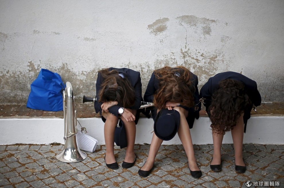 三位樂隊成員在參加祈求上帝賜福的遊行前小憩片刻,這一年一度的遊行已經持續了 200年。在過去,商品靠著小船從太加斯河一路運到首都里斯本,航程共 100公里,船上的水手們為了航海順利,都會藉著賜福遊行祈求上天保佑風平浪靜,讓他們能滿載而歸。