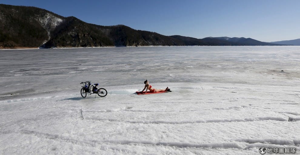 一名比基尼女郎在室外攝氏 13度下的葉尼塞河岸做日光浴,她的單車就停在一旁。