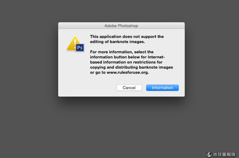 奇怪的是,一般常見的美國紙鈔如 1 美元、5 美元、10 美元、20 美元以及 50 美元,以及部分人民幣和南非蘭特仍然可以開啟圖像;筆者嘗試在 Windows 和 Mac 版本的 Photoshop 開啟且編輯台幣 100 元和 1,000 元鈔票的照片,同樣可以進行,還是歡迎讀者們一起試驗台幣的圖像是否可以開啟。