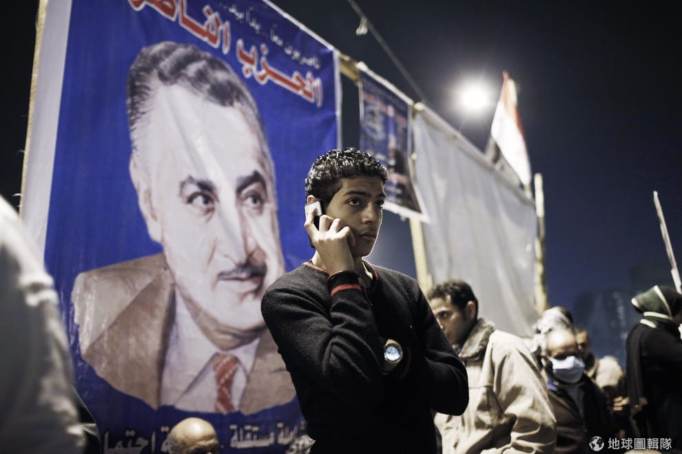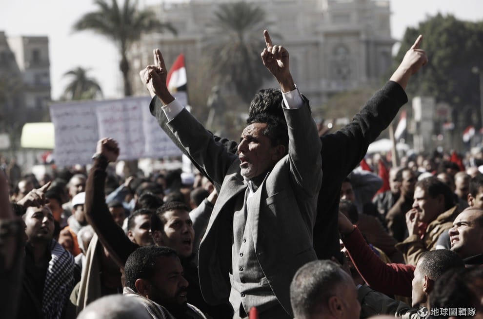 gettyimages布條上的人像就是前任埃及總統穆巴拉克,他專制統治埃及長達30年,最後被人民推翻下台。Ed Giles/Getty Images
