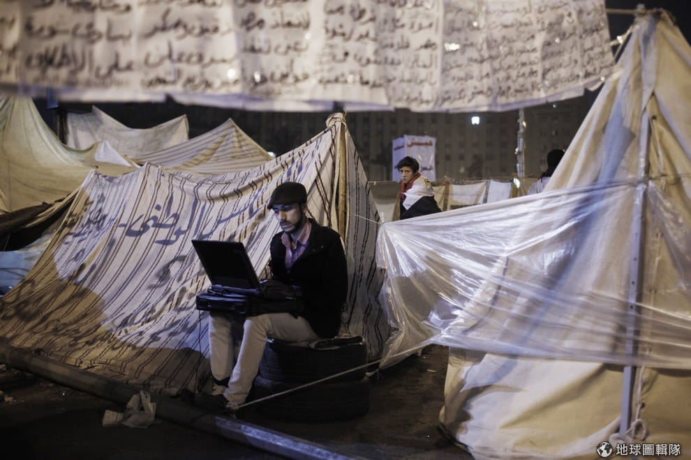 gettyimages在解放廣場上,也有埃及居民就拉起布條、架起帳棚的默默抗議。Ed Giles/Getty Images