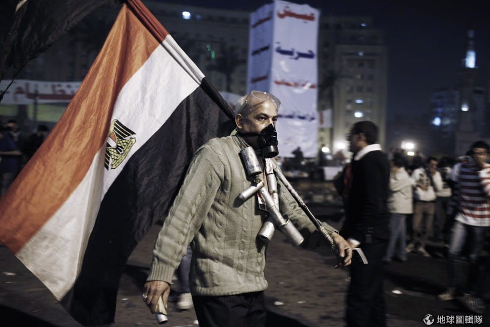 gettyimages身上掛滿空的催淚瓦斯罐、肩背埃及國旗的民眾。Ed Giles/Getty Images