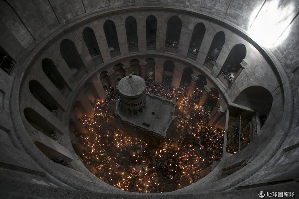 舊城區的聖墓教堂(Church of Holy Sepulchre)中,基督教信徒聚集在一起參加聖火儀式,聖墓教堂據說是耶穌基督當年在下葬前塗抹香膏(Anointing)的地點。