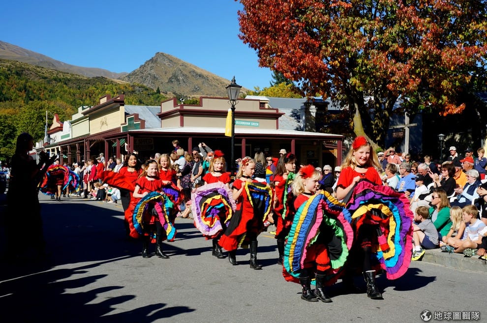 11號這天,紐西蘭的旅遊重鎮Queenstown旁的小鎮箭鎮(Arrowtown)舉行了秋季慶典遊行,照片中的小女孩們提著康康舞裙擺隨著花車大步前進。