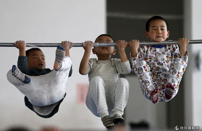浙江省的體育學校中,小朋友們正在一起練習引體向上動作。
