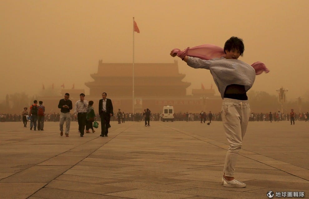 遊客站在天安門廣場前拍照,她周邊的景色因為沙塵暴的關係呈現一片黃澄澄的色調。報導指出,北京市 15日傍晚陷入一片沙塵,黃沙漫天,是近 13年來最嚴重的一次沙塵暴,象徵沙塵指標的PM10(懸浮微粒)數值高達每立方公尺 1000微克,呈現破表狀態,也是北京近年最嚴重的外來沙塵汙染。