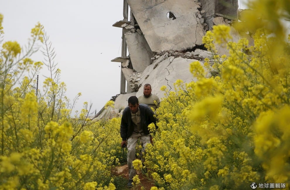 春天降臨的敘利亞開出朵朵黃花,照片中解放敘利亞民兵團正往前走向與政府軍對戰的前線。