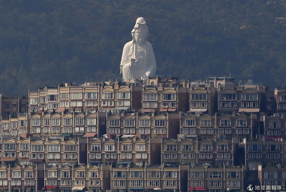 香港的大埔豪華住宅區後,可以見到知名的慈山寺觀音像,這座觀音像高達 76公尺,近期開始讓民眾預約參觀。慈山寺是由李嘉誠名下基金會捐資逾 17億港幣興建。