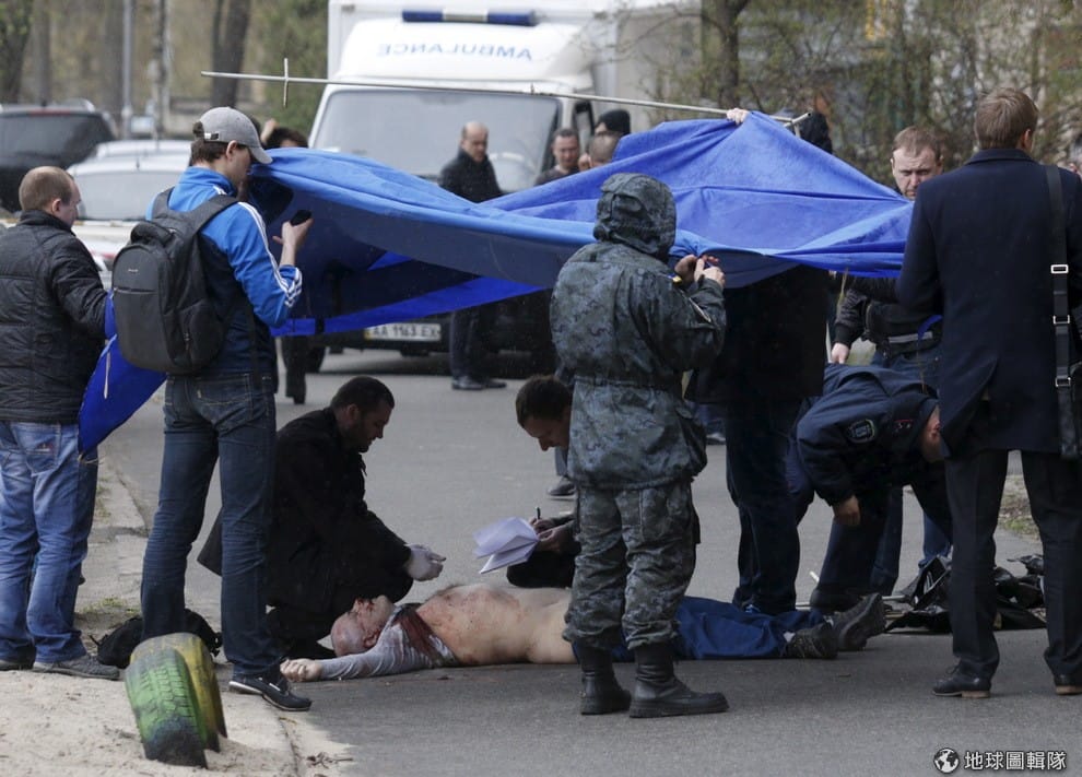 檢調人員正在檢查眼前的男子遺體,這名死者名叫布金納(Oles Buzina),他是一名親俄派記者,過去支持烏克蘭已經逃亡俄國的前總統亞努科維奇,他在 16號時傳出遭兩名蒙面槍手射殺。