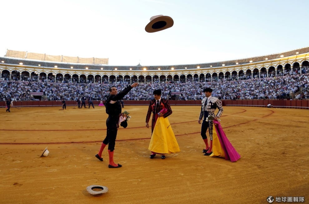 西班牙南邊的重要大城塞維亞(Seville)當地,競技場內可見鬥牛士曼薩納雷斯(Jose Maria Manzanares)刺殺完公牛後,和他的助手們一起朝觀眾致意。