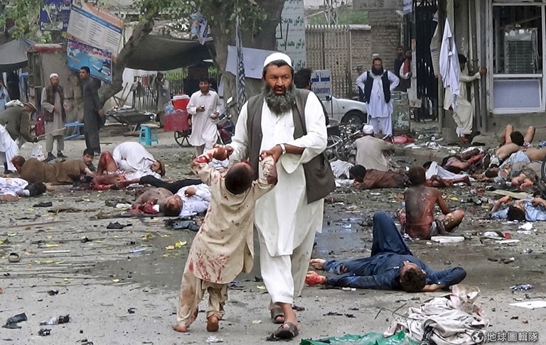 阿富汗東邊的賈拉拉巴德(Jalalabad)傳出自殺炸彈攻擊消息,照片中的男子拉起渾身是血的男孩往前走,他周遭地上全是被爆炸攻擊倒臥血泊的民眾,這起炸彈案發生在銀行外,釀成至少 33人死亡,超過百人傷。