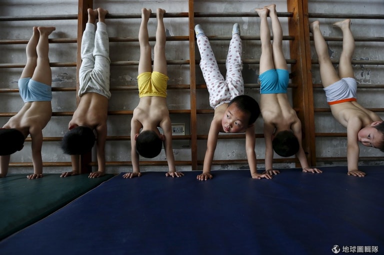 浙江省當地的體育學校中,小朋友們正在練習體操動作。