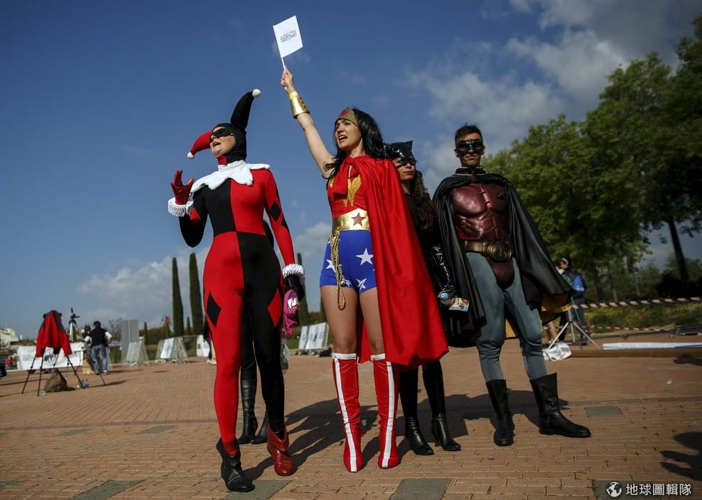 參加「世界DC漫畫英雄盛會」(World DC Comics Super Heroes)的人們聚集在一塊, 報導指出,這場由DC漫畫公司以及華納兄弟影業合辦的活動,在全球的 15個城市舉辦,從澳洲雪梨、英國倫敦、威爾斯卡地夫、法國巴黎、台灣高雄等地舉行,希望能夠一舉打破最多超級英雄聚會的紀錄。
