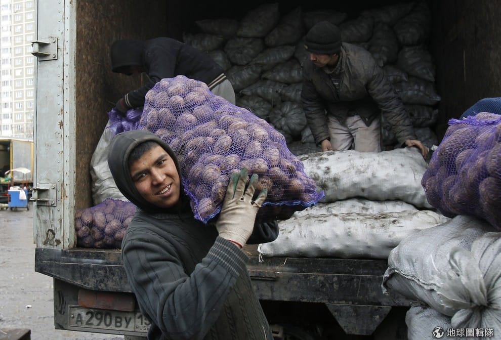 一群來自塔吉克的移工扛著蔬果,準備到莫斯科的菜市場上工。