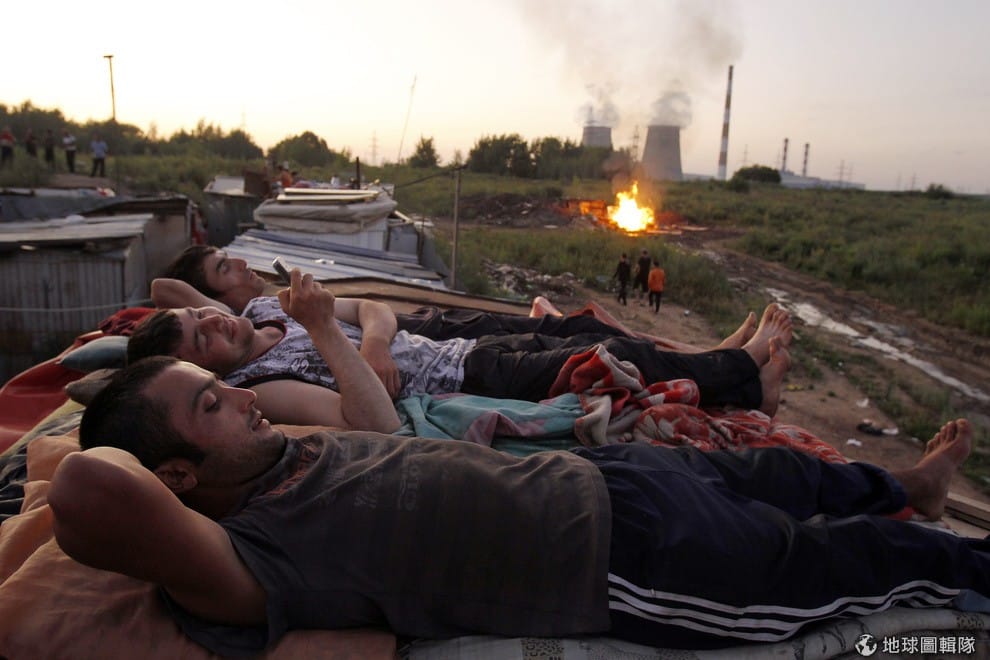一群下了班的塔吉克移工聚在一起,享受難得悠閒的時光。