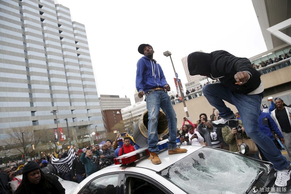 示威者跳上警車抗議黑人青年葛瑞(Freddie Gray)的死亡。根據報導,葛瑞被逮捕並羈押在巴爾的摩 1週後,於 4月19日死亡,死因是脊椎嚴重受創。葛瑞的死引起激烈的示威,1千多名示威者在 26號時邊喊著「關掉監獄」邊在巴爾的摩市遊行。