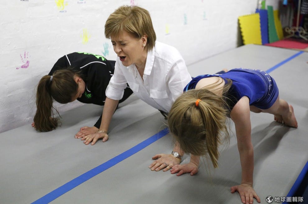 有「冷面甜心」之稱的蘇格蘭國家黨黨魁史特強(中,Nicola Sturgeon)在宣傳活動中,跟小朋友一起開心玩耍。帶領著蘇格蘭國家黨的史特強,是催生 2014年的蘇格蘭獨立公投的幕後功臣,史特強一開始在國會的時候因為作風太嚴肅,得到了「冷面甜心」的外號,不過她其實是個冷靜幽默的人,風趣的話常常逗笑她的夥伴。