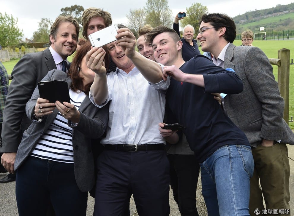 英國首相卡麥隆(David Cameron)跟支持者一起自拍。英國大選即將在 5月7日正式登場,現在英國各家政黨正緊鑼密鼓地進行宣傳,用力拉選票。