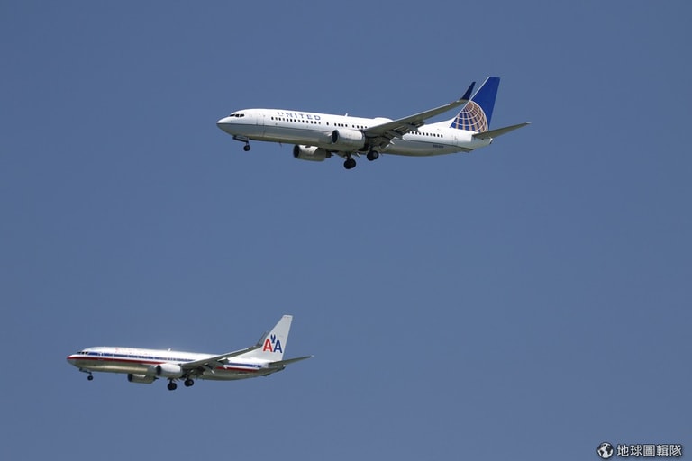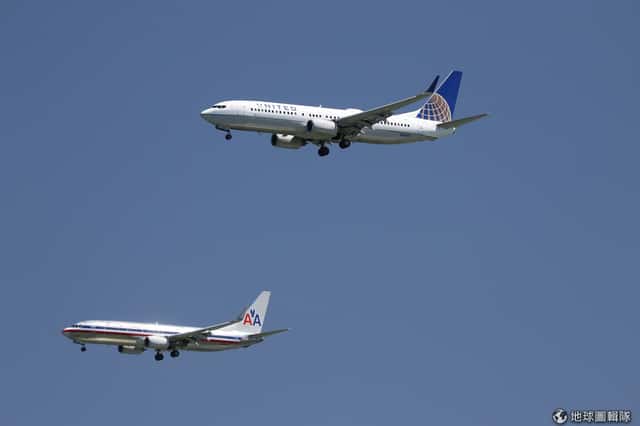 美國航空(左)和聯合航空的班機一起在天空中飛行。日前,美國航空有數十架班機因為App出問題,被迫停飛。