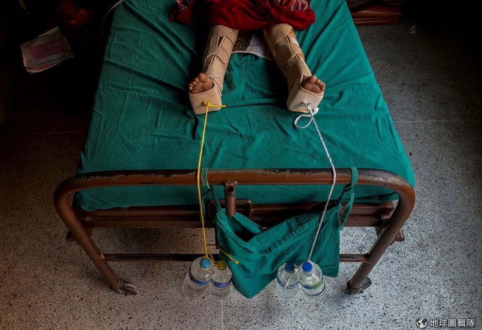 小女孩的腳在地震中骨折了,醫療人員在她的腳綁上水瓶,運用水瓶的牽引力來治療。