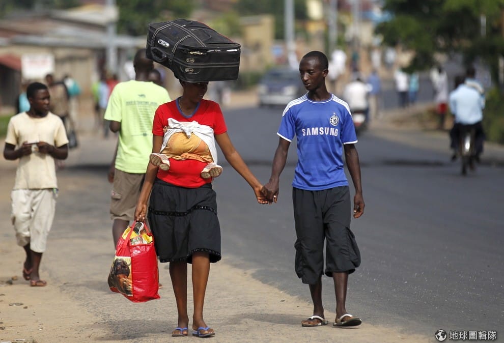 頭上、背上、手上都掛滿東西的女人空出一隻手牽住旁邊的男人,他們兩人害怕被示威衝突波及,帶著行李準備逃跑。蒲隆地執政黨在 25號時選了現任恩庫倫齊薩(Pierre Nkurunziza)當新任總統,讓他第三度帶領國家,但有批評說這個決定違反憲法,而且可能會造成東非國家的動盪。數千名民眾也因為不滿蒲隆地的總統連任,紛紛走上街頭示威。