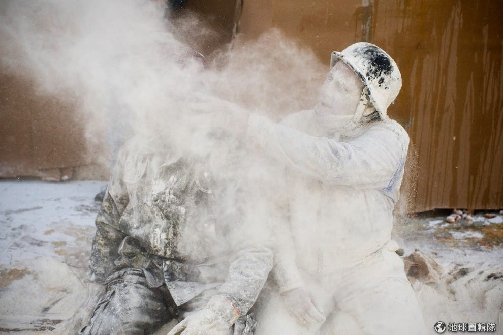 當你仔細一看,就會發現白色粉末完全不是什麼浪漫雪花,而是一袋又一袋的麵粉!