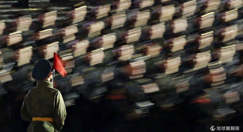 俄國軍人在莫斯科知名廣場紅場(Red Square)上預演,為 9號的遊行做準備。1945年5月9日,德軍在第二次世界大戰中投降,簽下了《德國無條件投降書》,9號的遊行就是為了慶祝同盟國勢力在大戰中打贏德國納粹七十周年。