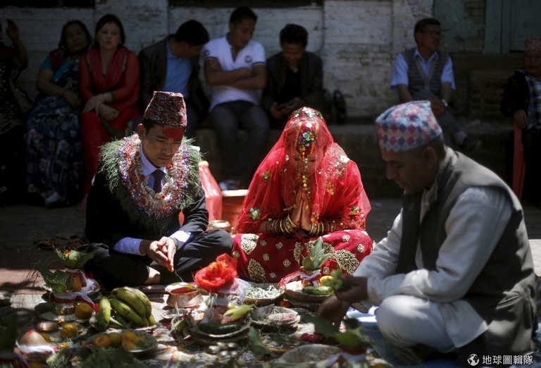25歲的新郎賈里(左,Khil Bahadur Ghale)和 24歲新娘雱(Bishma Punj)在加德滿都的廟裡舉行結婚儀式。儘管尼泊爾在上星期發生大地震,造成無數的傷亡,這對伴侶仍決定要繼續舉辦婚禮。