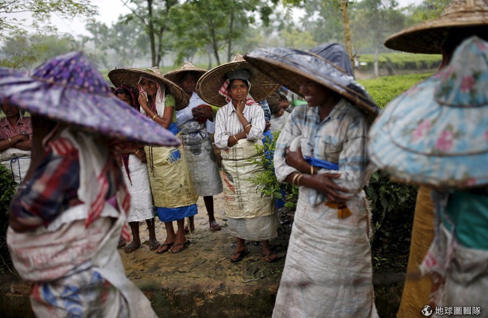 印度阿薩姆邦的採茶工人,頭上戴著用竹葉和棕櫚葉編成的斗笠(jappi),等待雨停好繼續工作。阿薩姆邦是阿薩姆紅茶的產地,有「茶葉部落」的稱號,但近年來的氣候變遷影響了阿薩姆邦的經濟,不穩定的雨水減少茶葉產量,增加茶公司的成本。