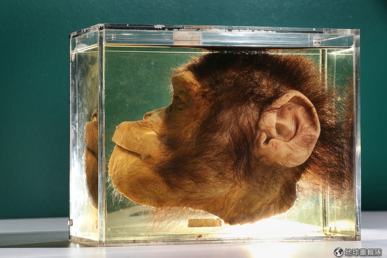 乍看有點可怕的黑猩猩頭部展品。Peter Macdiarmid/Getty Images