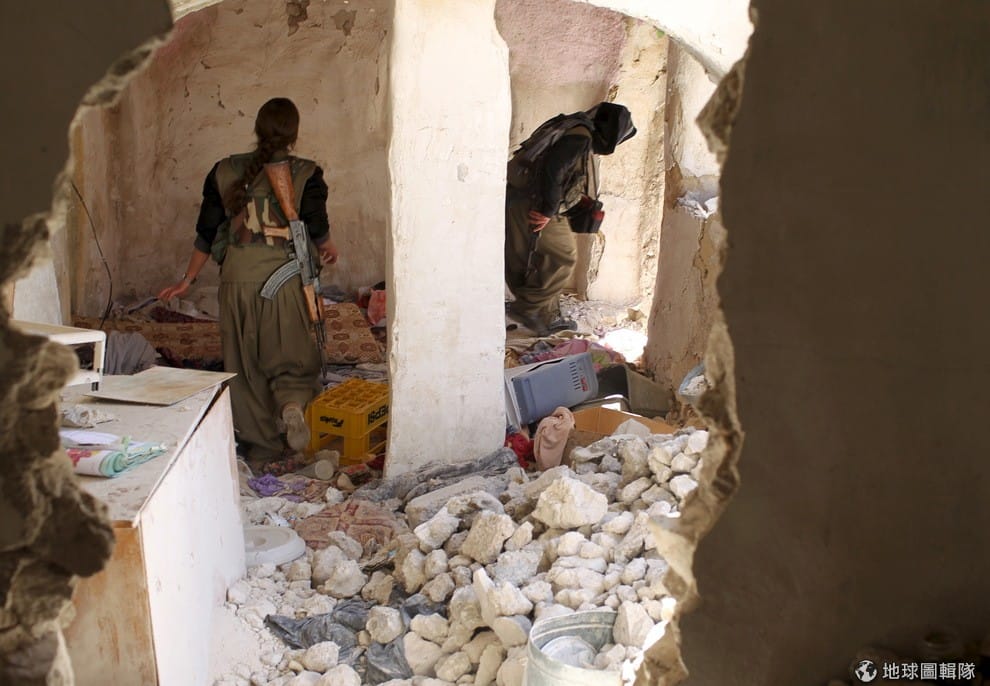 路透社庫德族戰士走進被摧毀的房子,戰士們剛從伊斯蘭國手裡奪回附近的區域。