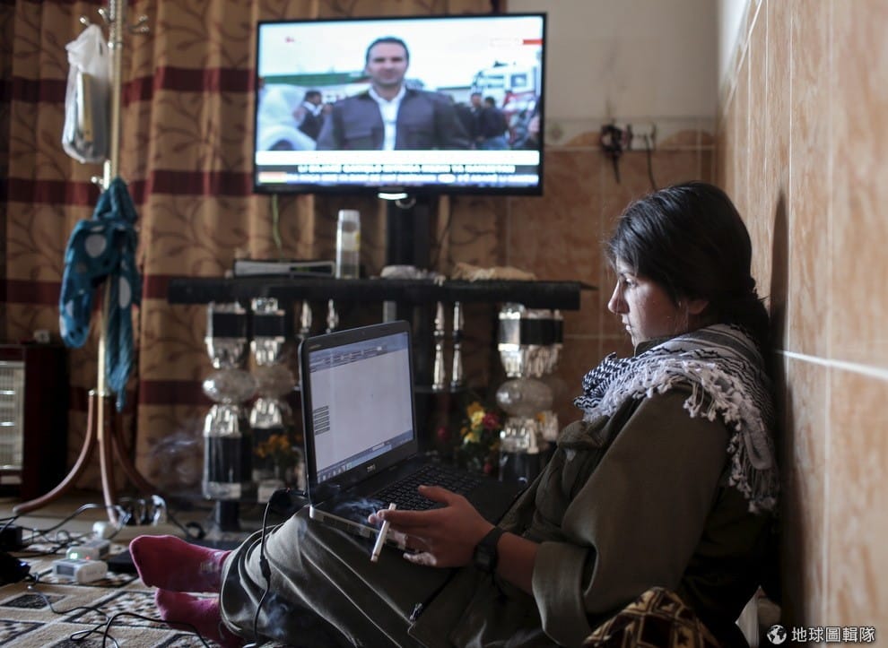 庫德女戰士邊聽著電視新聞的報導,邊用筆記型電腦工作。