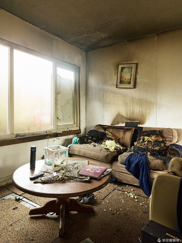 從圖中我們可以發現,火災只在起居室的沙發留下明顯的焦黑燒痕,前方的木桌完好無缺。一旁窗戶的裂痕與火災帶來的破壞不同,透過火痕和熱感應器,可以推測火勢是從窗邊蔓延。再透過電子檢測器材的輔助,鑑識官發現沙發表面還有地毯上都有易燃液體。
