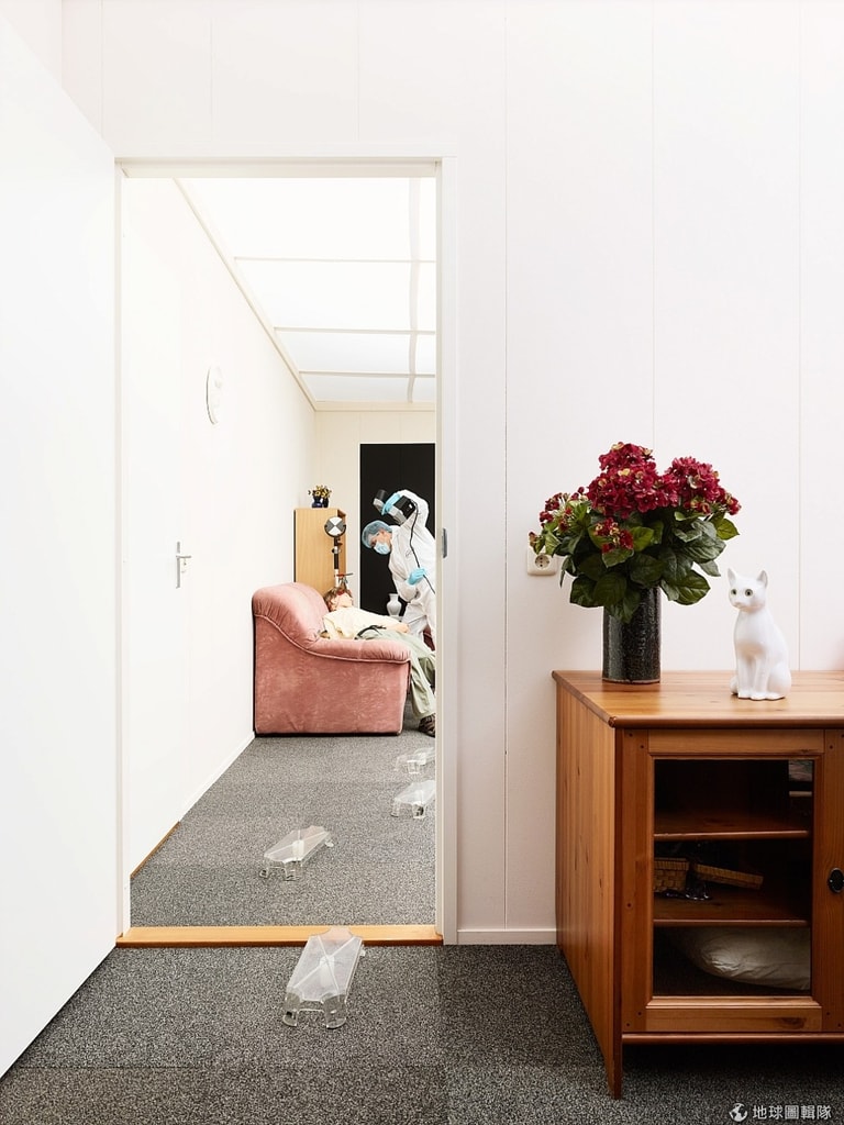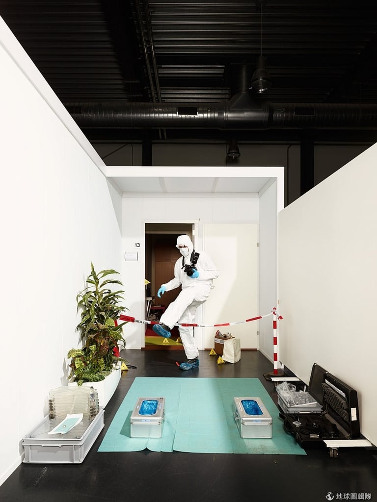 鑑識人員戴著口罩和手套,穿著防護衣,身上還掛著一台紀錄現場的相機,從封鎖線中走出來。為了防止鞋印影響辦案,鞋子也得套上專用的藍色塑膠套,左方還堆著透明長形的踏步板,讓鑑識人員可以腳不沾地的在現場移動。