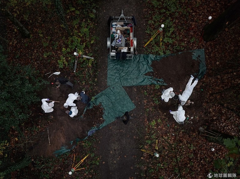 圖中白色球體專門用來定位,之後可以利用 3D掃描儀重建現場。在挖掘出屍體後,整個犯罪現場都會被 3D掃描儀記錄下來,連一點細節都不放過。