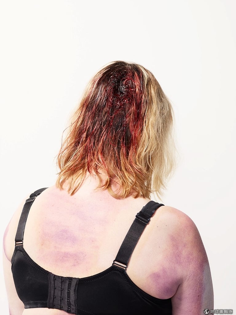第一眼看到圖中的專業演員會馬上被她頭上的傷吸引,大片大片的血液凝結在後腦勺,身上的紫色瘀青標誌出死者生前受虐的部位。