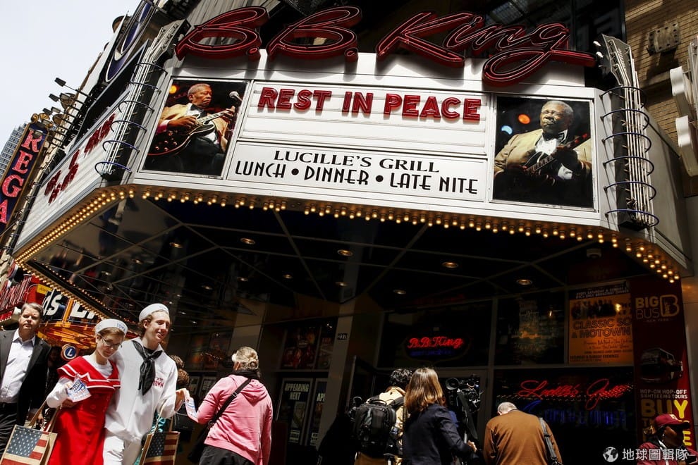 著名爵士樂手比比金(B.B. King) 14號晚間在拉斯維加斯逝世,享壽 89歲,紐約時代廣場上的比比金爵士燒烤吧掛出大大的致哀字樣。人稱藍調傳奇的比比金曾獲《滾石雜誌》(Rolling Stone)評為最偉大的吉他手,也同時入選「藍調基金名人堂」(Blues Foundation Hall of Fame)和「搖滾名人堂」(Rock and Roll Hall of Fame)。拿過 15座葛萊美獎的他成功讓藍調音樂躋身主流,影響包括吉他之神艾瑞克克萊普頓(Eric Clapton)在內的樂壇後輩。