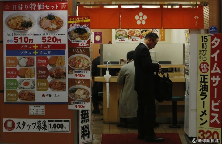 日本上班族正在買餐券。日本的薪水已經凍漲很久,經過談判後,日本數家大公司宣佈將會調薪。