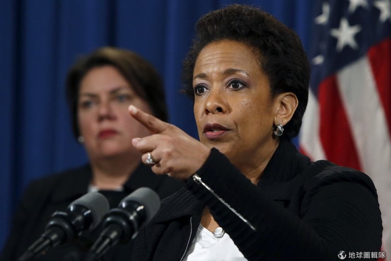 圖為美國司法部長林奇,她在記者會上宣布對非法操縱外匯市場的銀行開罰。