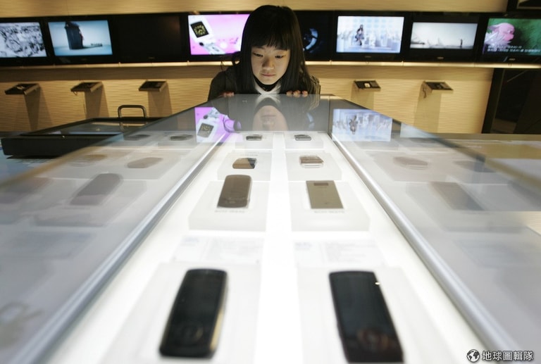 一名女孩正看著展示櫃中陳列的智慧型手機。
