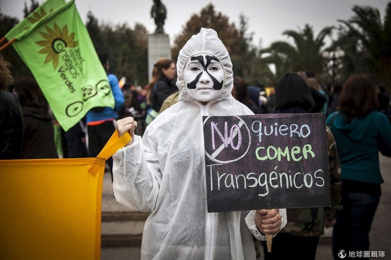 抗議基因改造食品的示威者,拿者標語「我不想吃基改食品」,從 23號開始,世界各地都有示威民眾抗議孟山都(Monsanto)出產Roundup除草劑及RoundupReady基改大豆。