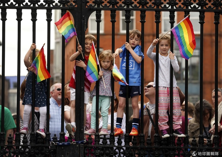 愛爾蘭的孩童揮舞著支持同志婚姻的彩虹旗,等待公投結果出爐。